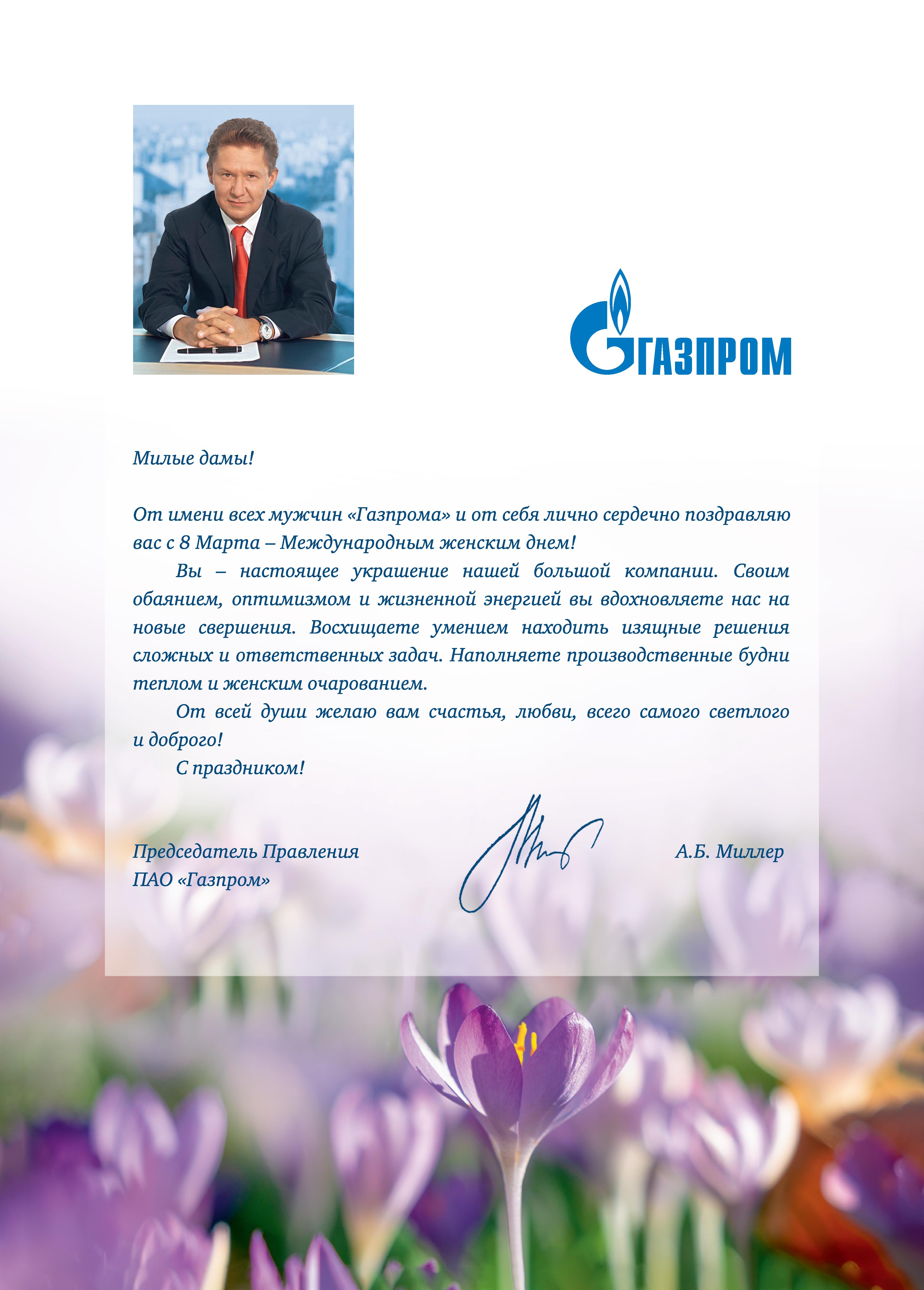 От имени всех мужчин «Газпрома» и от себя лично сердечно поздравляю вас с 8 Марта — Международным женским днем!
