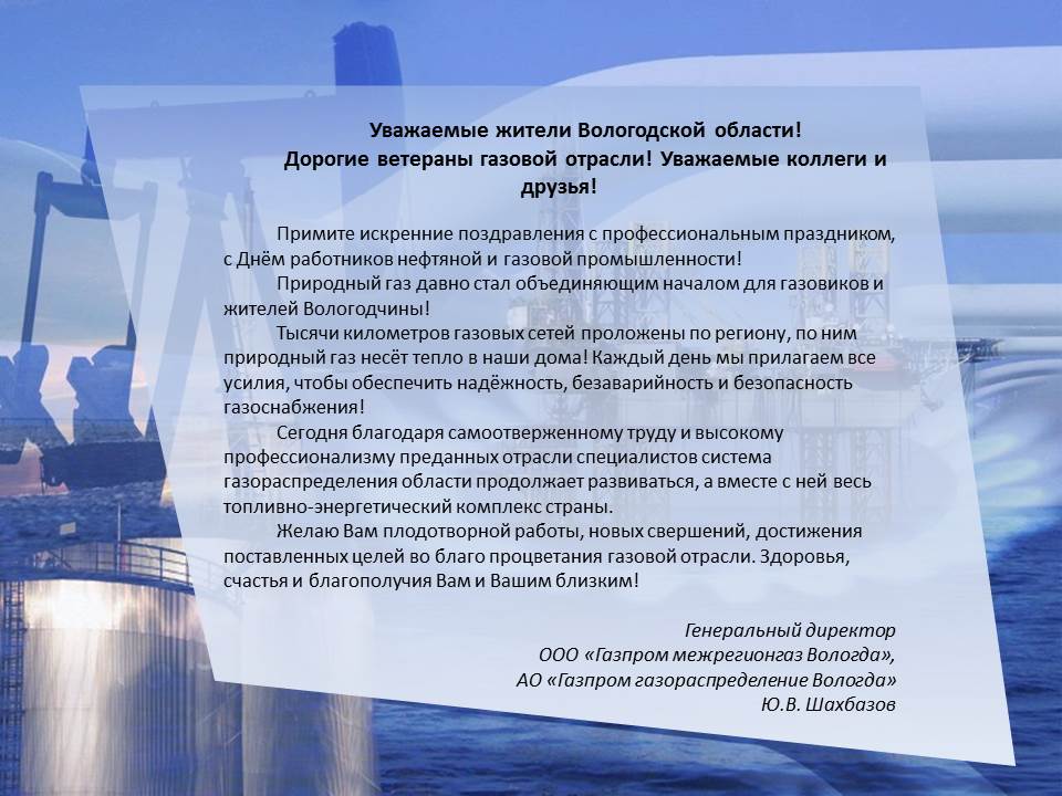 Уважаемые жители Вологодской области! Дорогие ветераны газовой отрасли! Уважаемые коллеги и друзья!