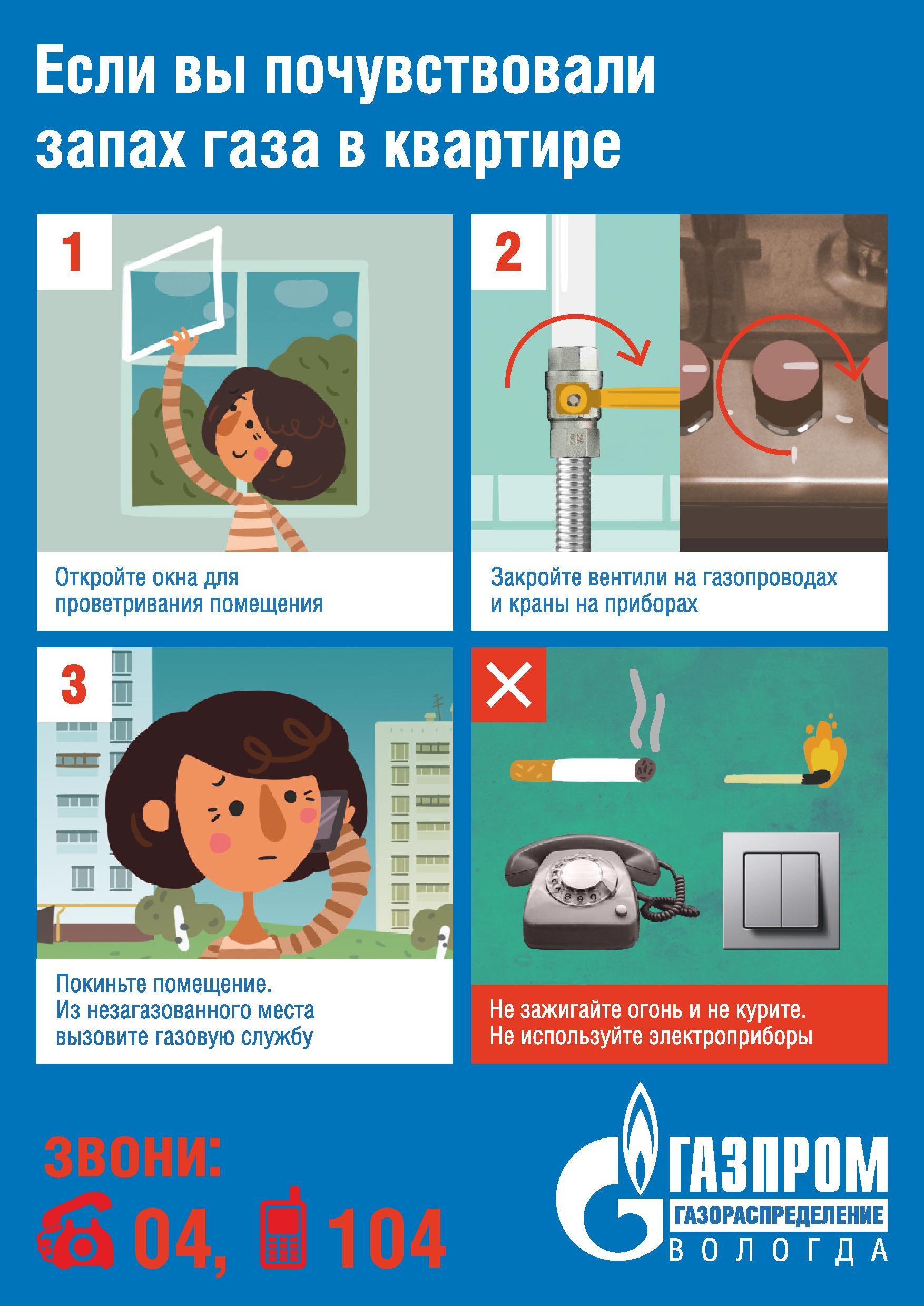 Если вы почувствовали запах газа дома или в подъезде, следует срочно проветрить помещение, перекрыть вентили на газовых трубах, не включая при этом свет и электроприборы, и позвонить в аварийно-диспетчерскую службу по телефонам 04 или 112.
