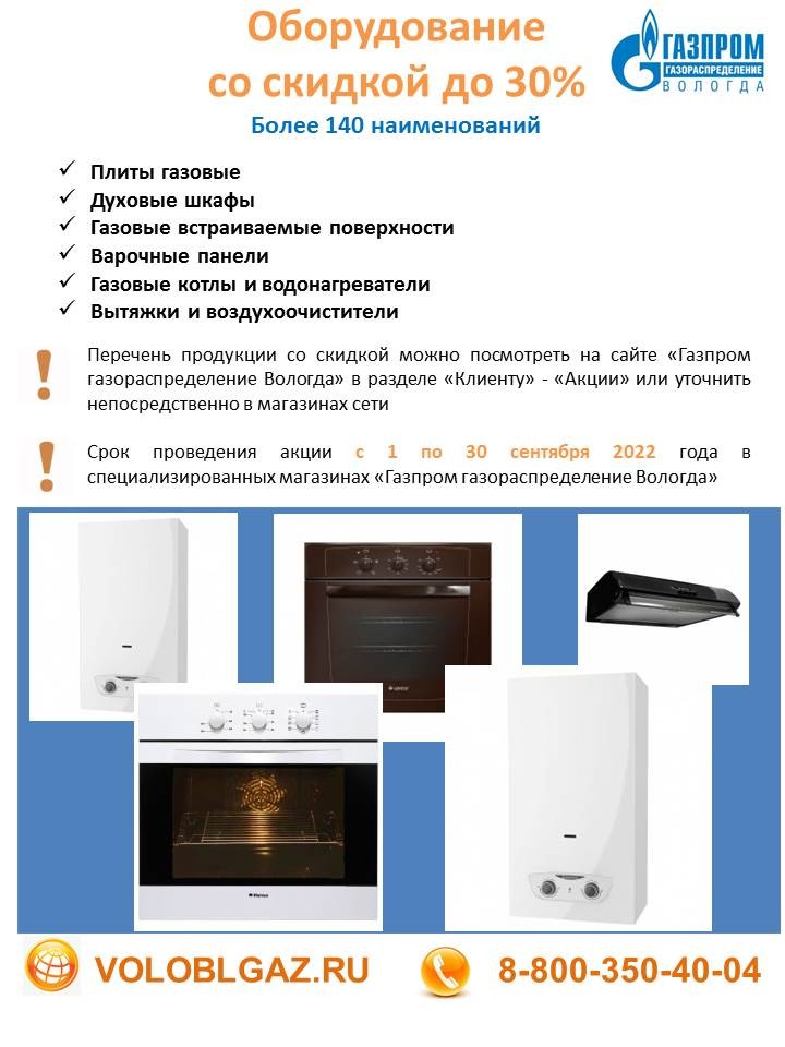 *Срок проведения акции с 1 по 30 сентября 2022 г. Скидки применяются при 100% оплате газового оборудования, приобретаемого в специализированных магазинах «Газпром газораспределение Вологда», расположенных в подразделениях компании в 16 газифицированных районах области (адреса на сайте voloblgaz.ru в разделе «Контакты»).